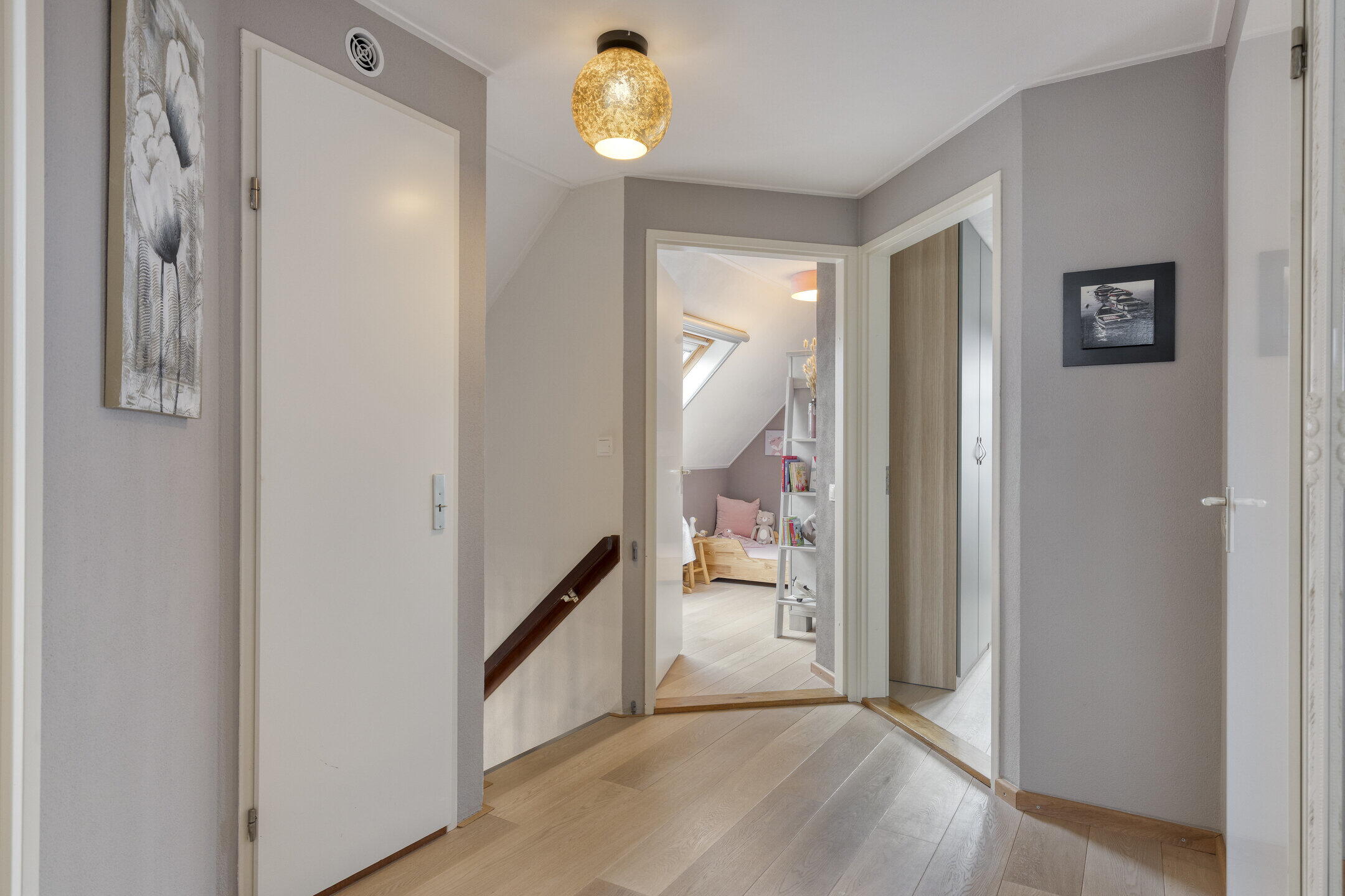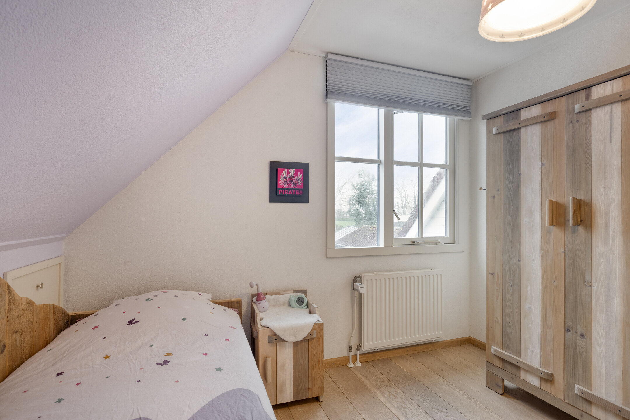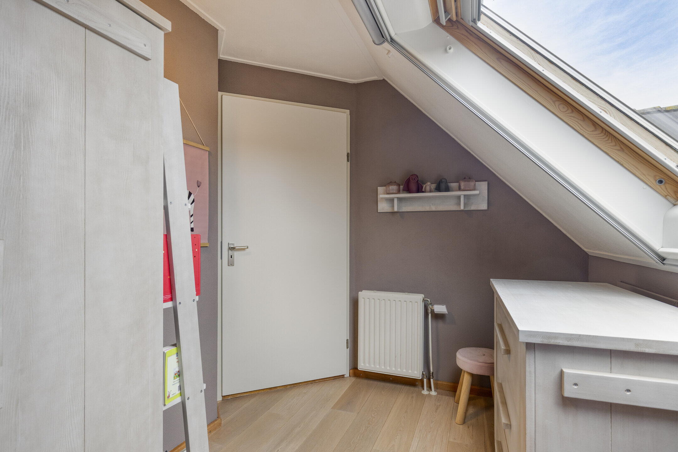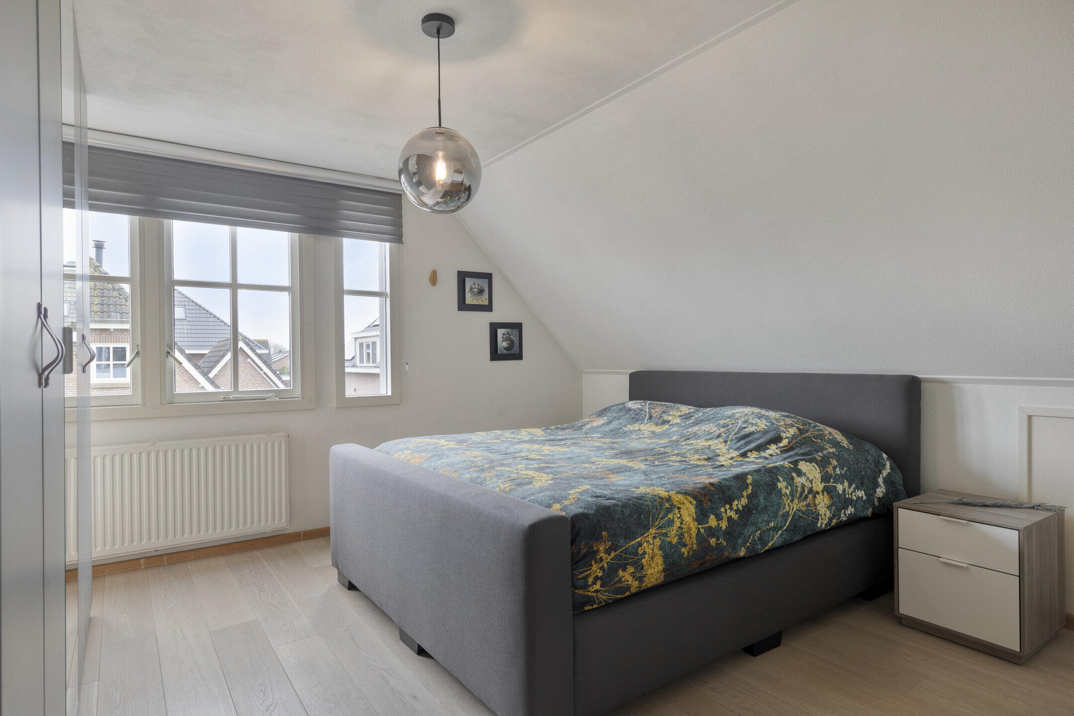 Eerste verdieping: op de overloop is toegang tot de vlizotrap naar de vliering en een vaste kast met daarin de opstelling van de Nefit cv-ketel uit 2019. Deze verdieping kent oorspronkelijk al vier slaapkamers maar één van de kamers is tevens als verkeersruimte in gebruik om een vijfde slaapkamer te ontsluiten. Alle kamers zijn royaal van formaat, beschikken over bergruimte achter de knieschotten en twee kamers zijn voorzien van dakramen. De volledige eerste verdieping is afgewerkt met een eikenhouten parketvloer, wat zorgt voor een warme en verzorgde uitstraling. Deze ruimtes zijn ook uitstekend geschikt als hobbyruimte of thuiswerkplek.