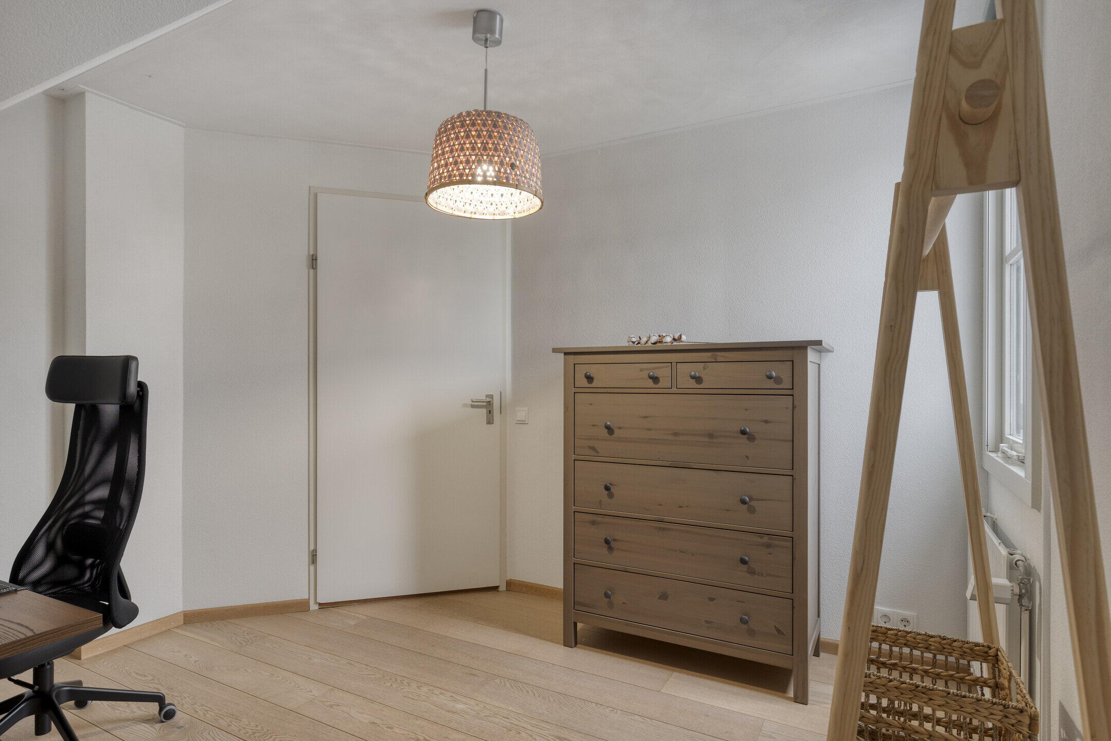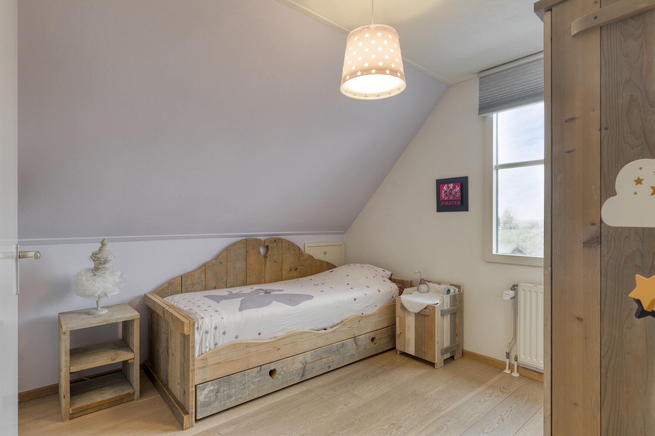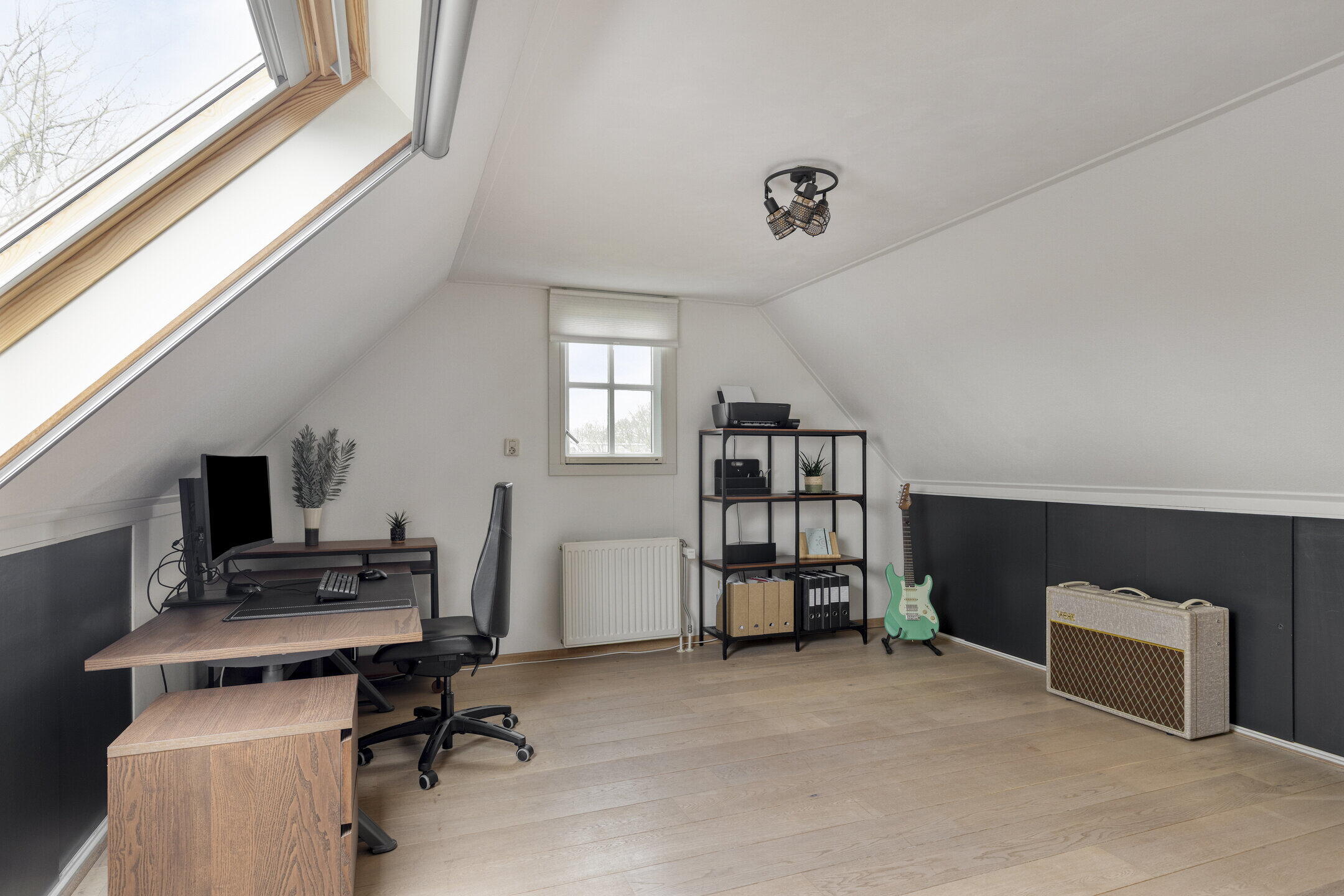 Eerste verdieping: op de overloop is toegang tot de vlizotrap naar de vliering en een vaste kast met daarin de opstelling van de Nefit cv-ketel uit 2019. Deze verdieping kent oorspronkelijk al vier slaapkamers maar één van de kamers is tevens als verkeersruimte in gebruik om een vijfde slaapkamer te ontsluiten. Alle kamers zijn royaal van formaat, beschikken over bergruimte achter de knieschotten en twee kamers zijn voorzien van dakramen. De volledige eerste verdieping is afgewerkt met een eikenhouten parketvloer, wat zorgt voor een warme en verzorgde uitstraling. Deze ruimtes zijn ook uitstekend geschikt als hobbyruimte of thuiswerkplek.