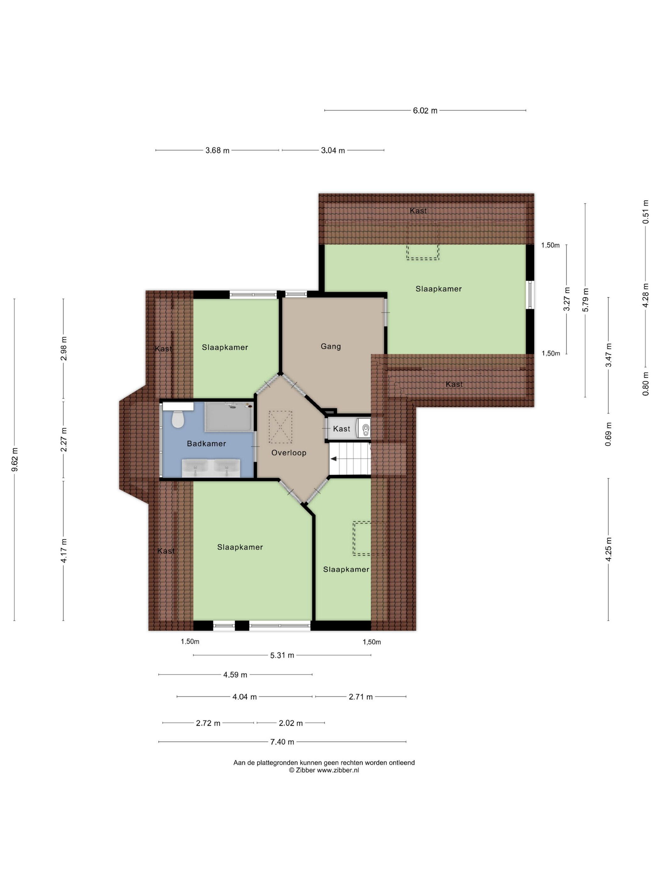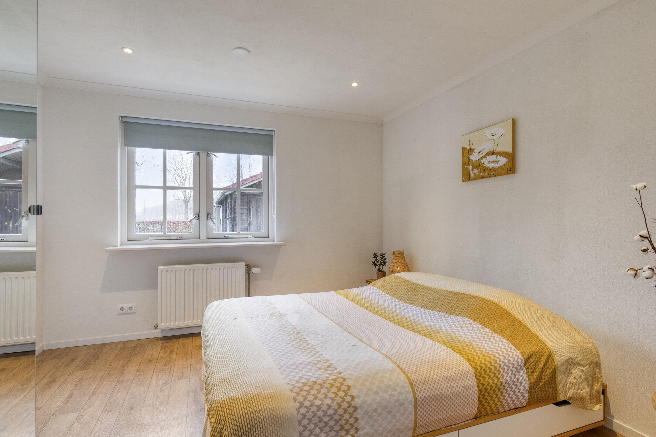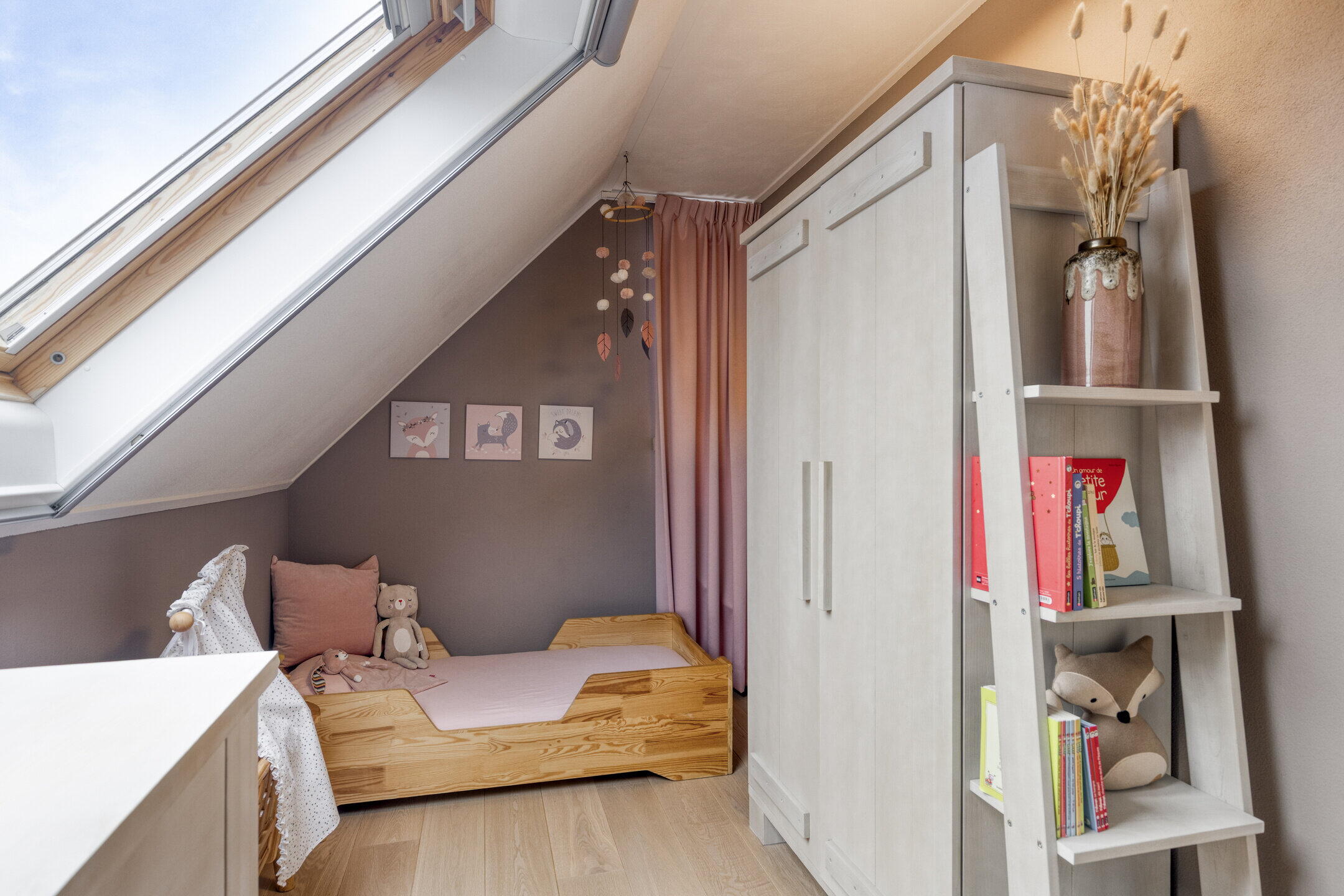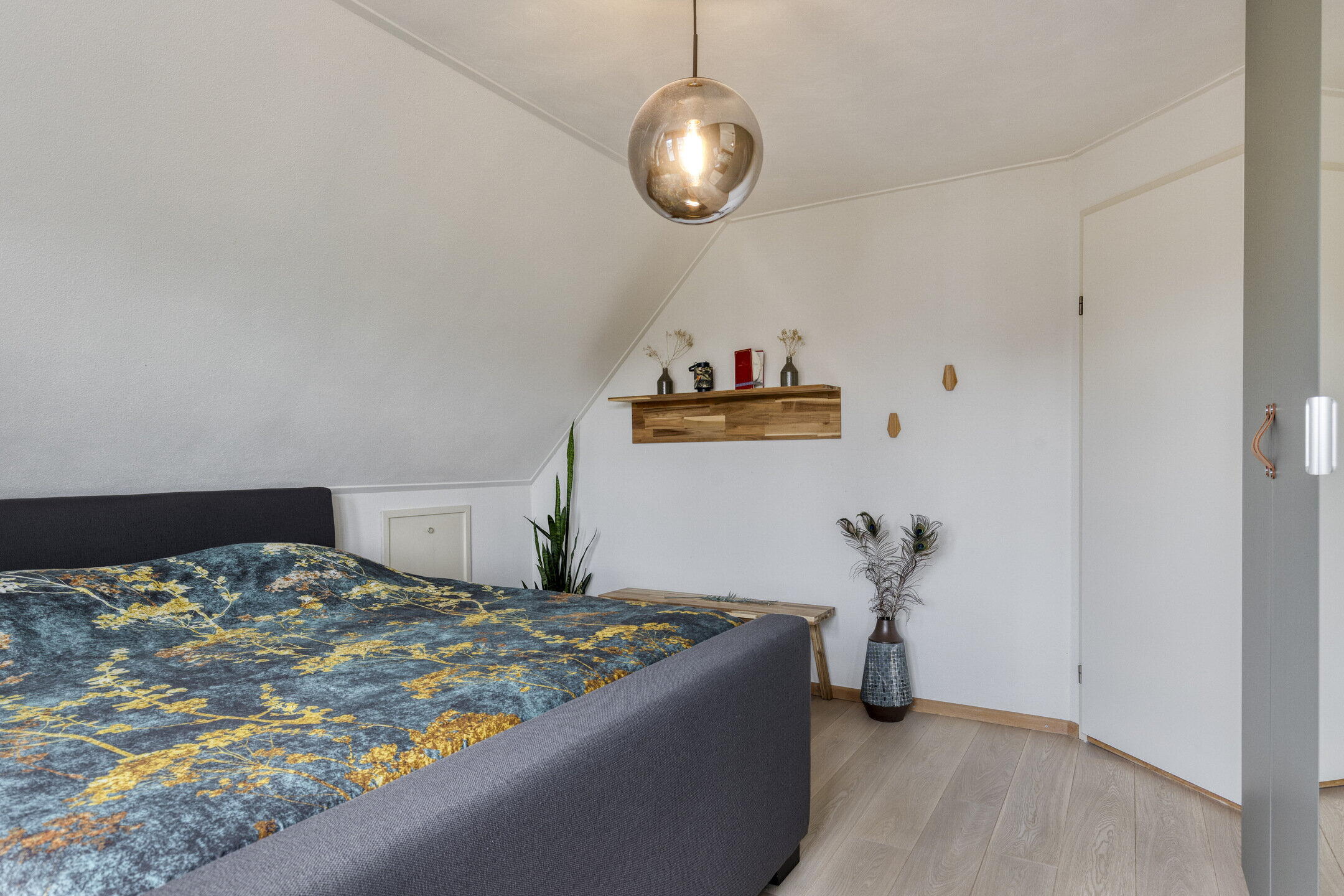 Eerste verdieping: op de overloop is toegang tot de vlizotrap naar de vliering en een vaste kast met daarin de opstelling van de Nefit cv-ketel uit 2019. Deze verdieping kent oorspronkelijk al vier slaapkamers maar één van de kamers is tevens als verkeersruimte in gebruik om een vijfde slaapkamer te ontsluiten. Alle kamers zijn royaal van formaat, beschikken over bergruimte achter de knieschotten en twee kamers zijn voorzien van dakramen. De volledige eerste verdieping is afgewerkt met een eikenhouten parketvloer, wat zorgt voor een warme en verzorgde uitstraling. Deze ruimtes zijn ook uitstekend geschikt als hobbyruimte of thuiswerkplek.