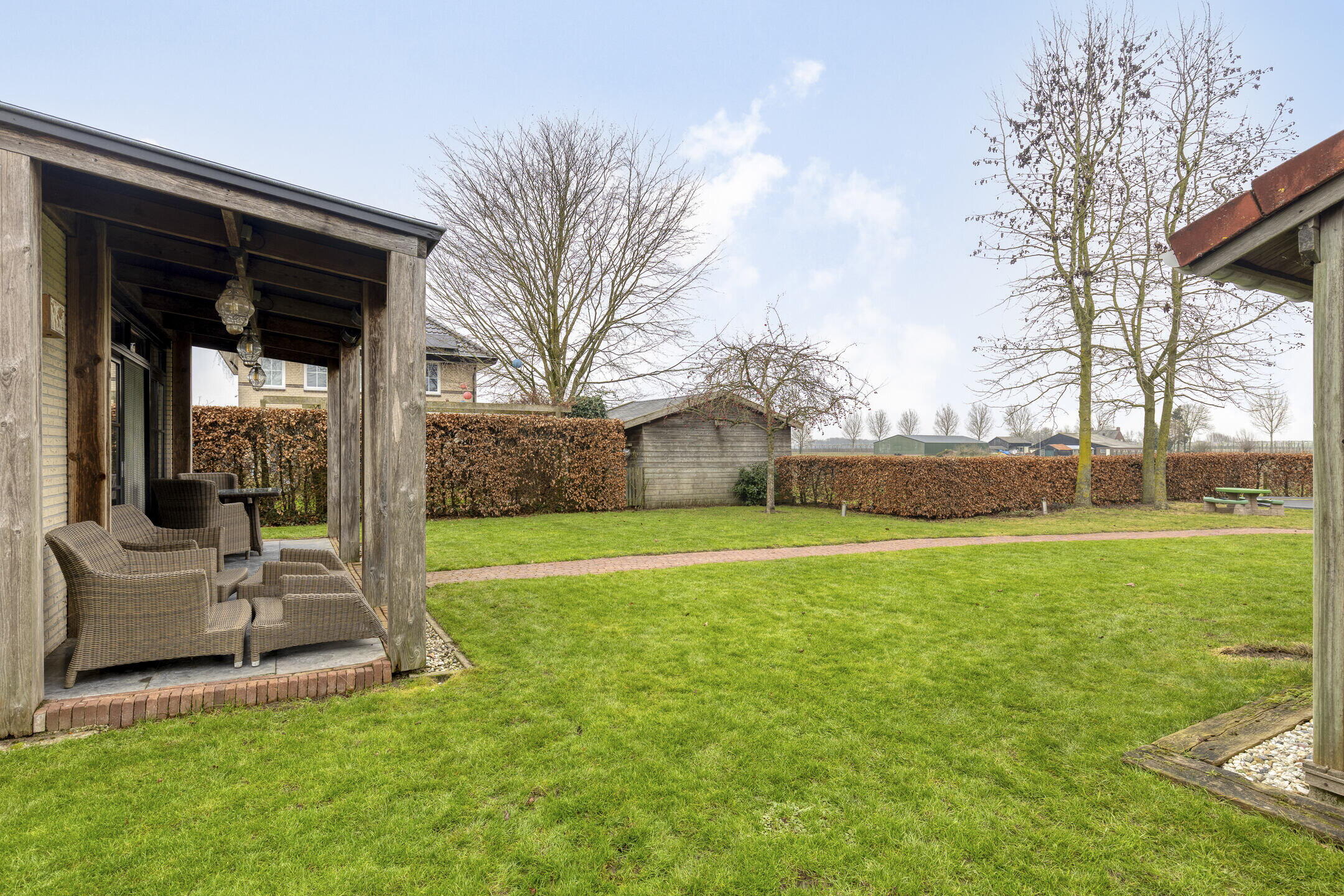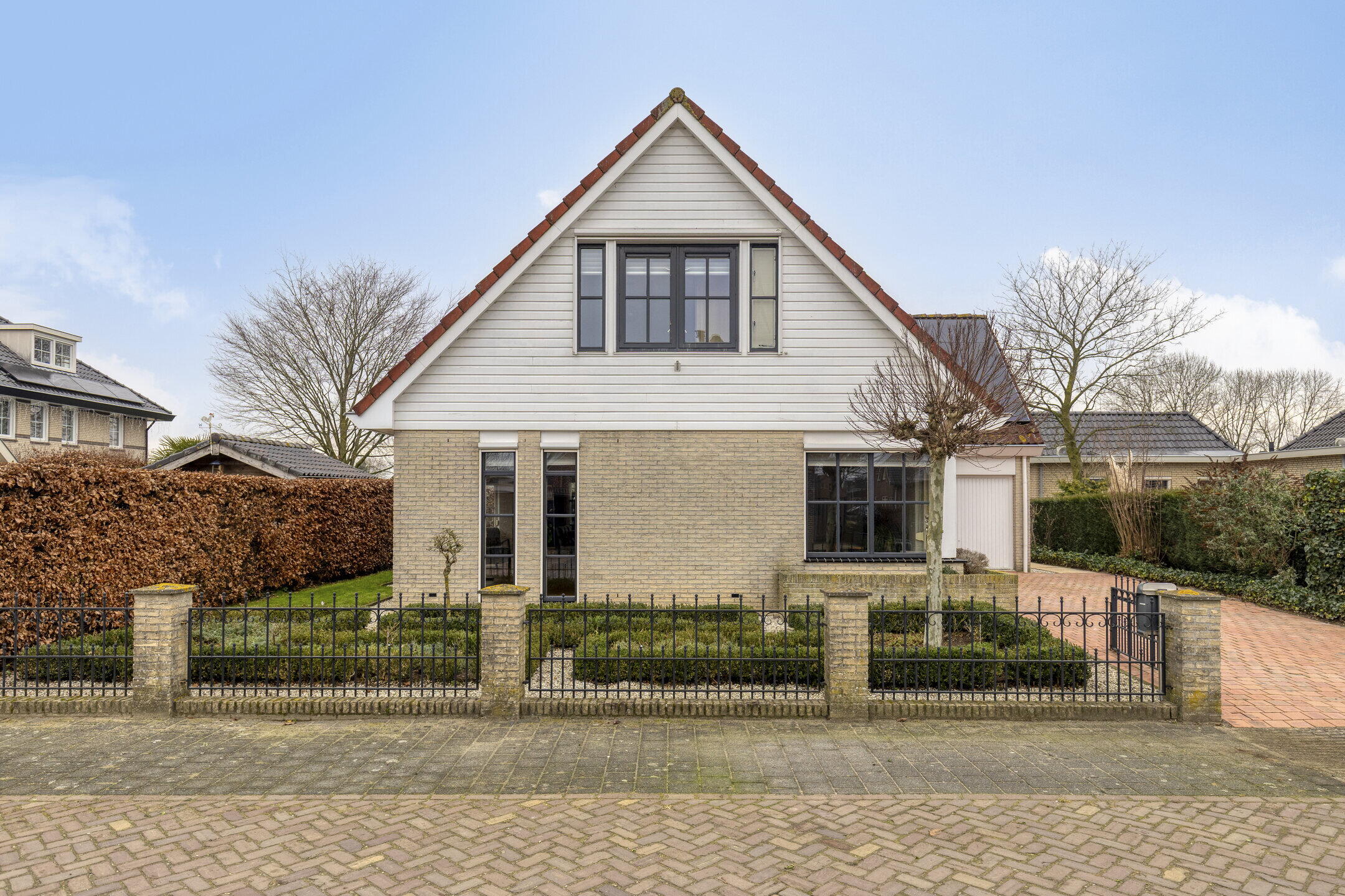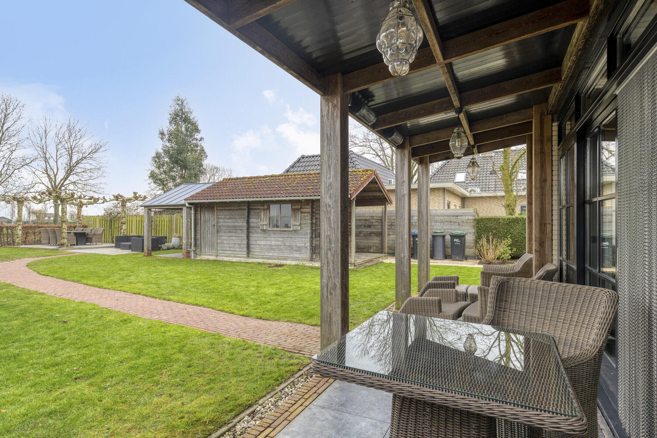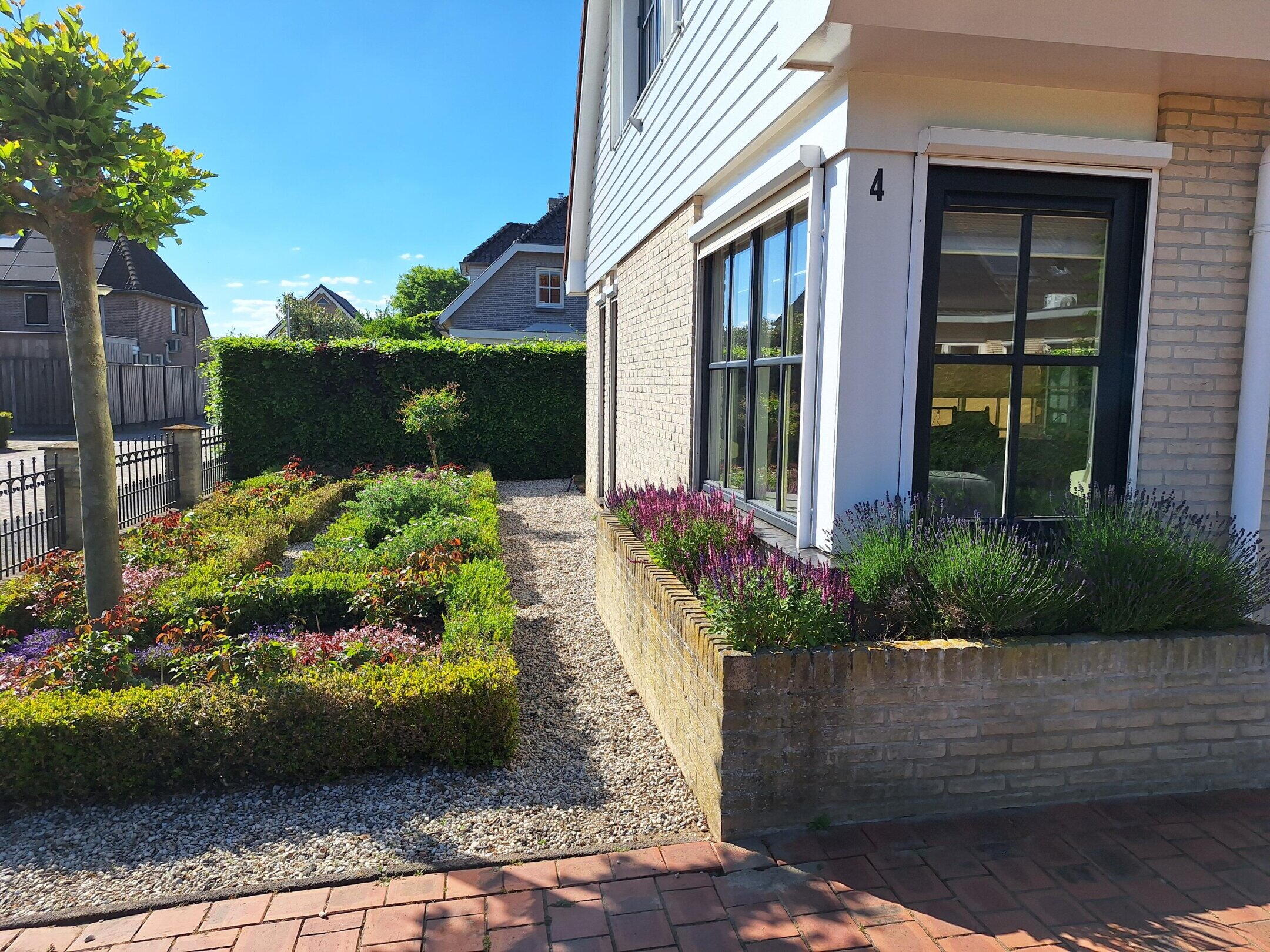 De woning heeft een bestraat voorterrein als oprit met laadpaal richting de voordeur en voorts een aangeplante voor-, zij en achtertuin. De achtertuin is met meer dan 27 meter diep en circa 15 meter breed een heerlijke plek om te genieten van rust, ruimte en privacy. Er is een houten bijgebouw aanwezig voor de opslag van fietsen, tuinspullen of hobbybenodigdheden. Aan deze berging zit ook een overstek met daaronder een terras dat is ingericht als buitenkeuken met een Boretti barbecue, perfect voor lange zomeravonden.