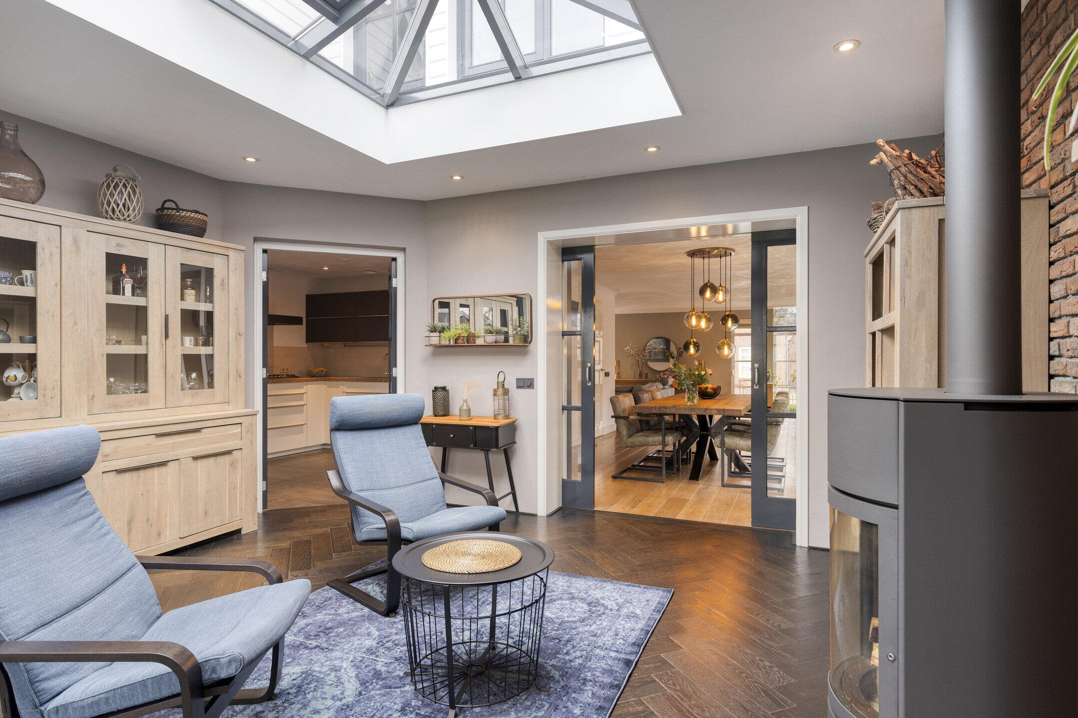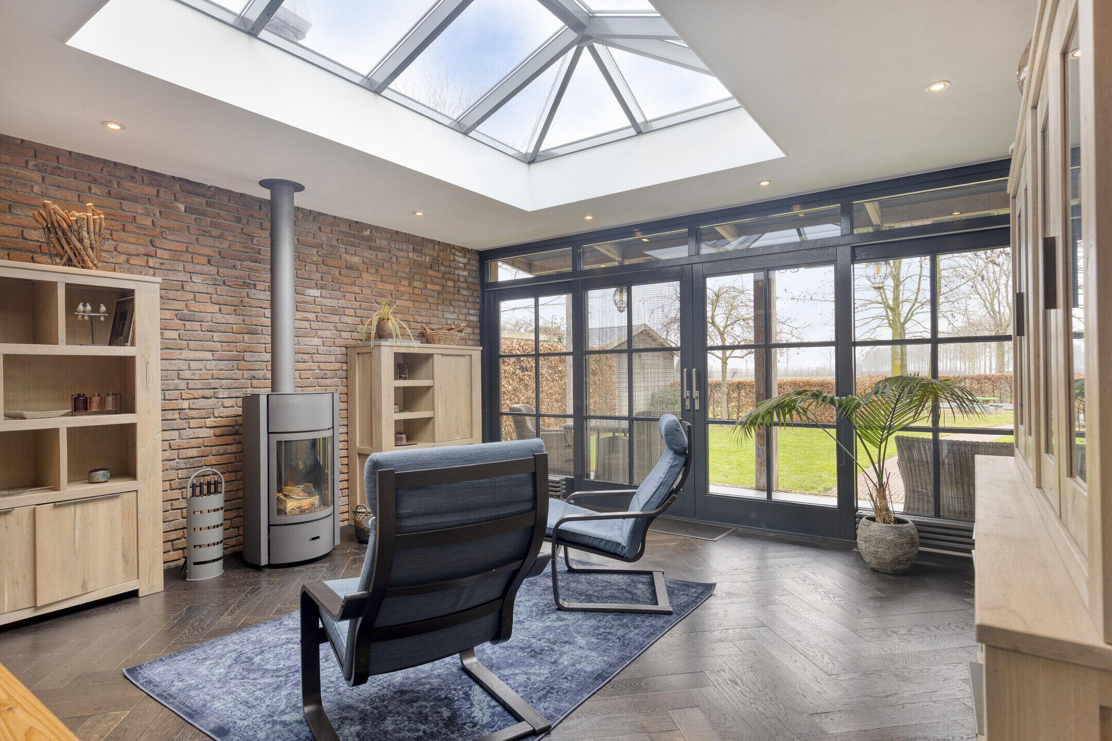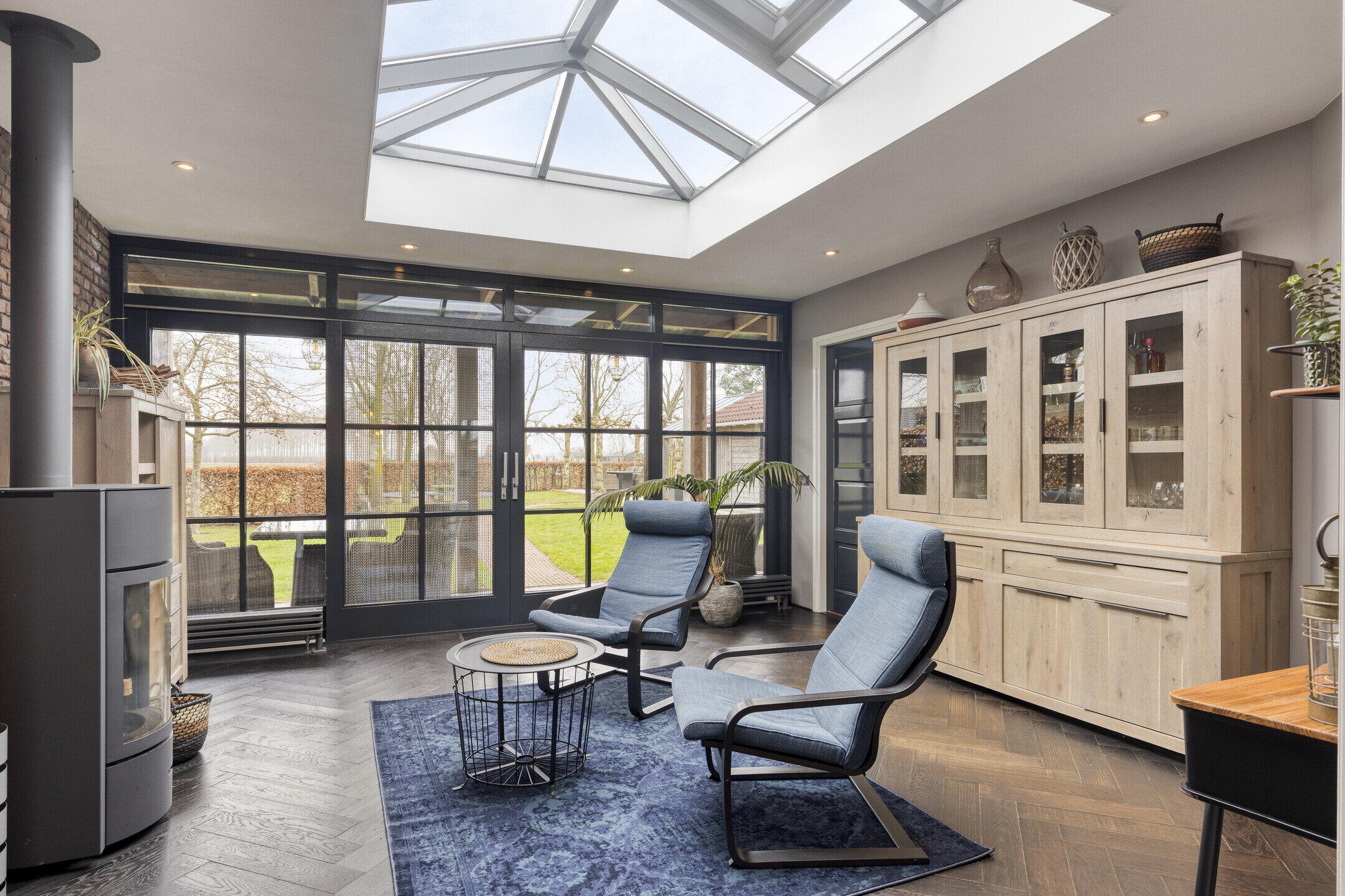 Via de en-suite deuren bereik je de tuinkamer, zonder twijfel één van de meest bijzondere ruimtes van de woning. Dit is een ruimte waar je elk seizoen wilt zijn. De lichtstraat zorgt voor prachtige lichtinval en de grote schuifdeuren naar het overdekt terras laten binnen en buiten in elkaar overvloeien. De houtkachel voegt warmte en sfeer toe, waardoor dit een heerlijke plek is voor rustige ochtenden, lange avonden en alles daartussenin. Naast de schuifdeuren richting het terras kun je ook via een portiek met vaste kast de tuin bereiken.