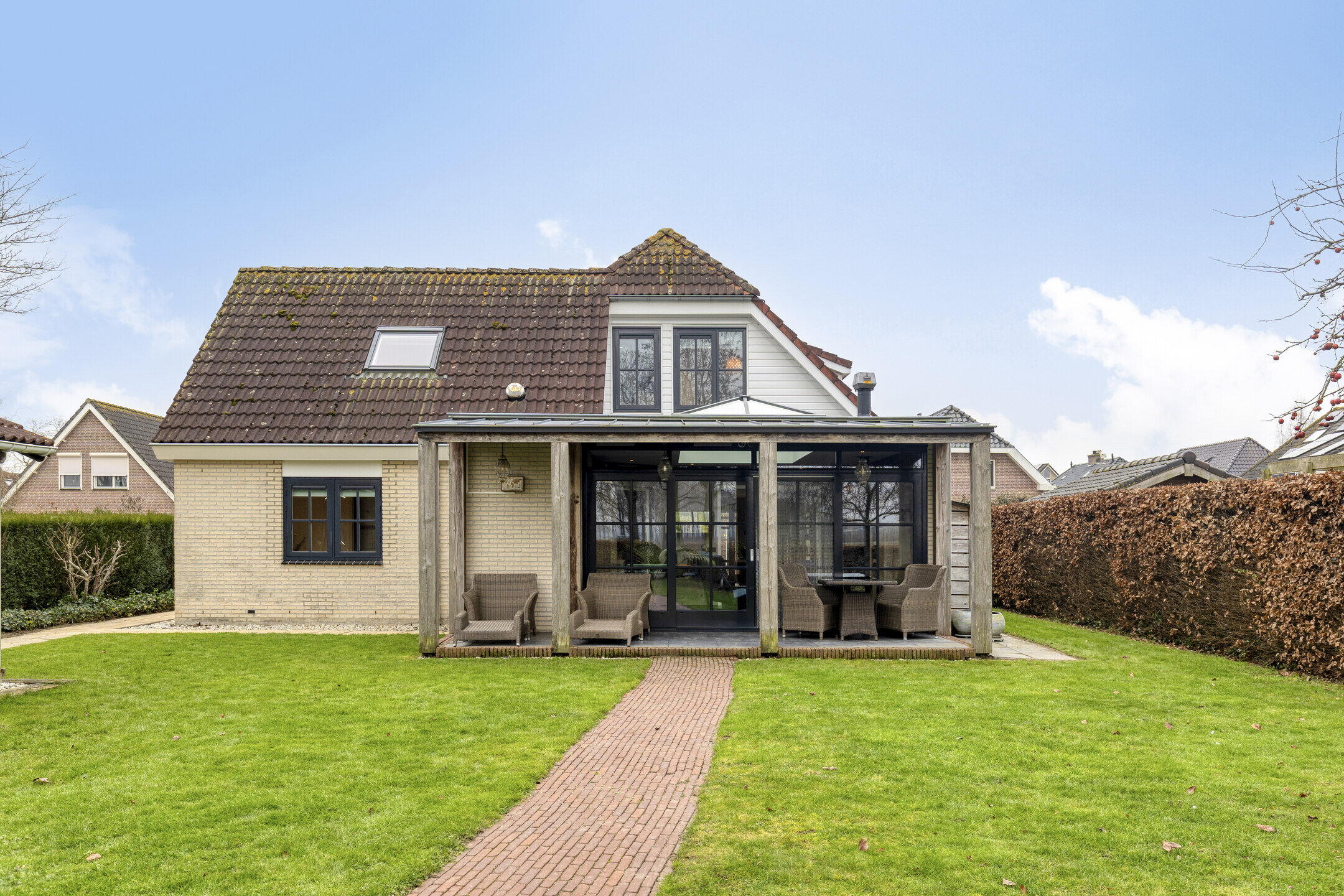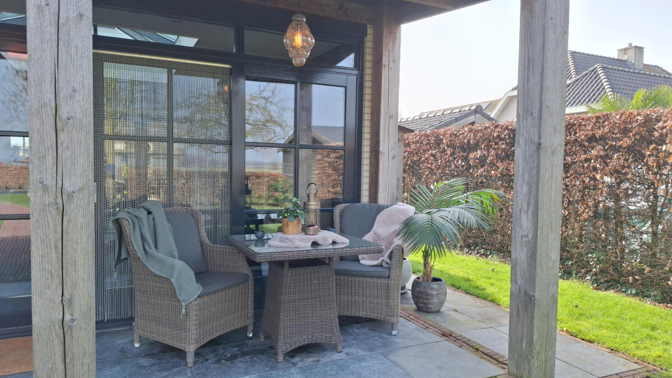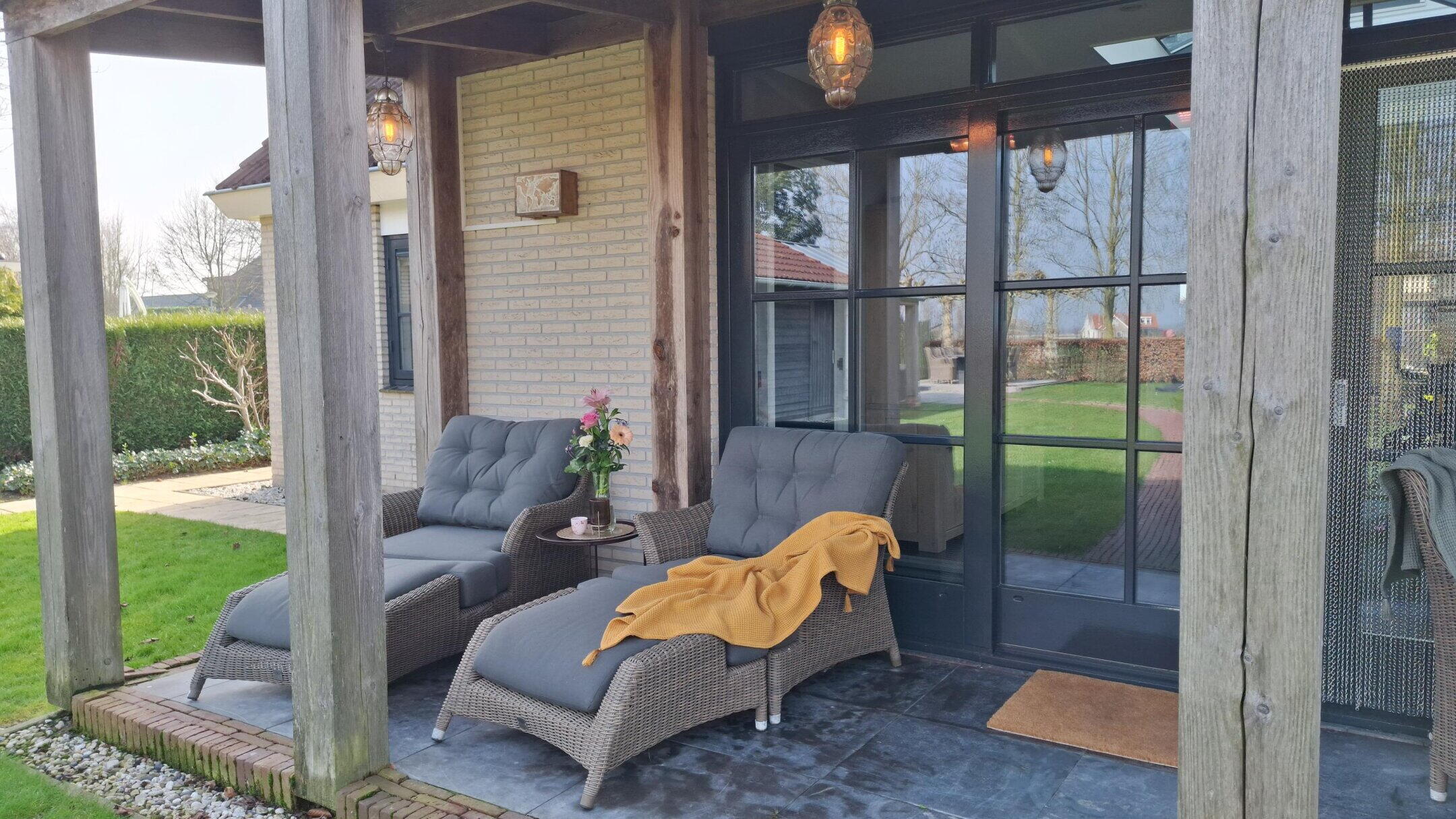 Via de en-suite deuren bereik je de tuinkamer, zonder twijfel één van de meest bijzondere ruimtes van de woning. Dit is een ruimte waar je elk seizoen wilt zijn. De lichtstraat zorgt voor prachtige lichtinval en de grote schuifdeuren naar het overdekt terras laten binnen en buiten in elkaar overvloeien. De houtkachel voegt warmte en sfeer toe, waardoor dit een heerlijke plek is voor rustige ochtenden, lange avonden en alles daartussenin. Naast de schuifdeuren richting het terras kun je ook via een portiek met vaste kast de tuin bereiken.