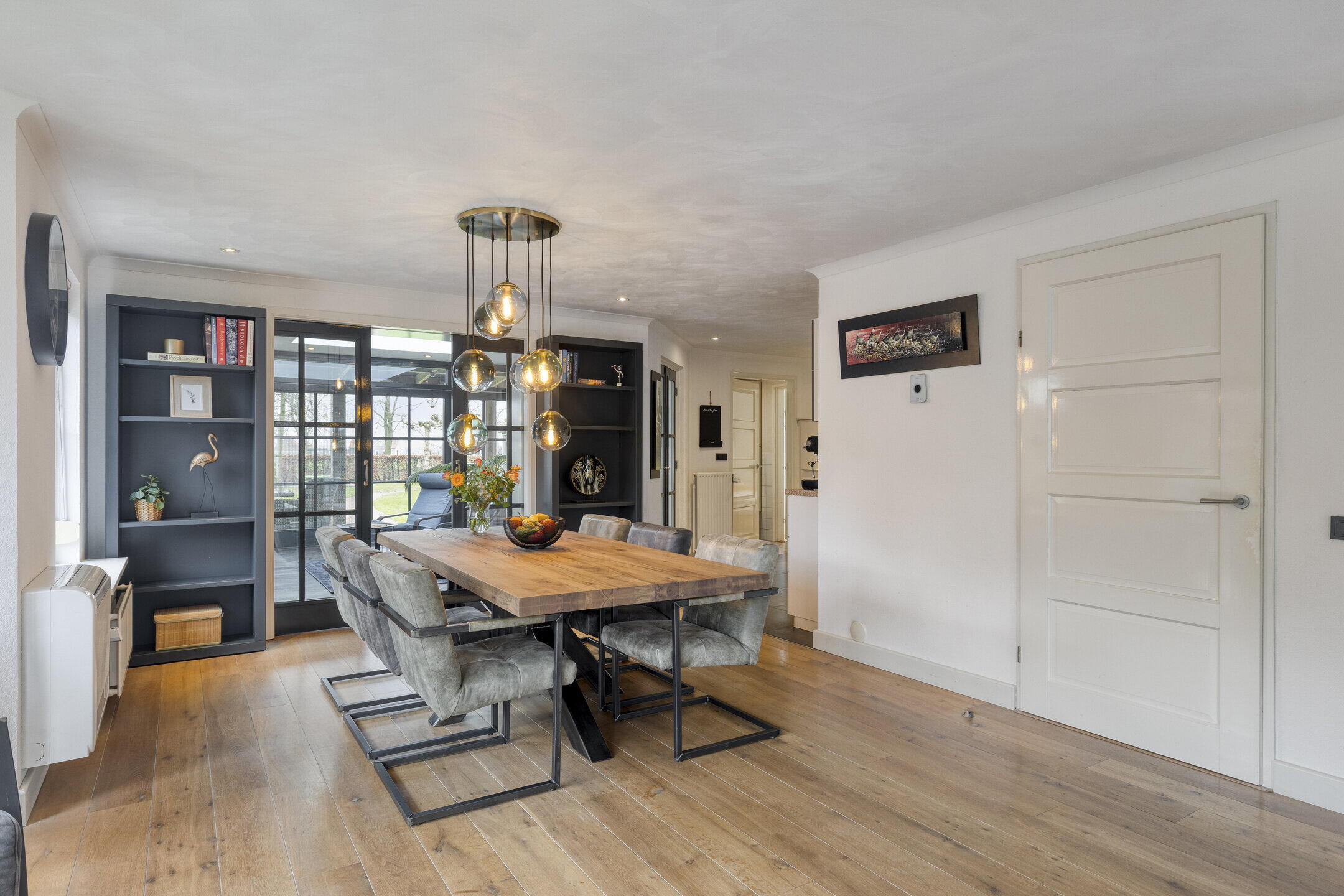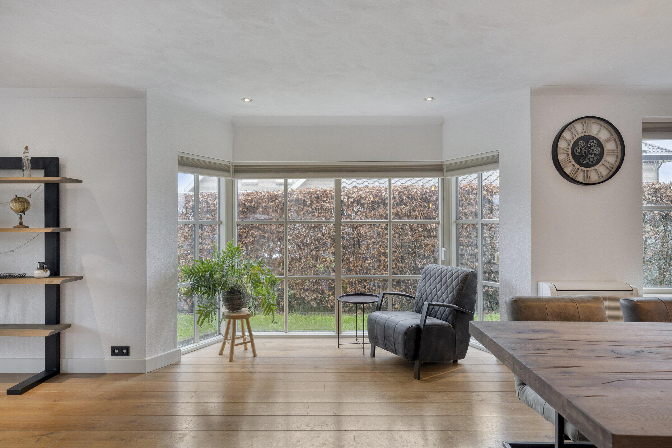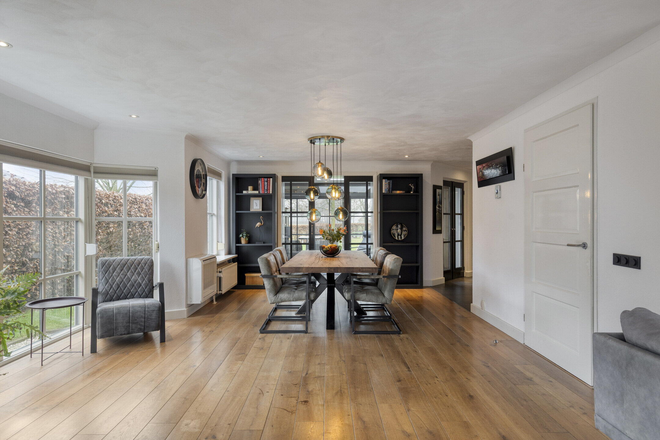 De zeer royale woonkamer biedt volop ruimte voor een comfortabele zithoek, waar je heerlijk tot rust komt. De erker aan de zijkant zorgt voor een prettige lichtinval rondom de eettafel. Hier past met gemak een groot formaat eettafel, ideaal voor lange diners en gezellige momenten met familie en vrienden. De woon- en eetkamer zijn afgewerkt met een houten vloer, wat bijdraagt aan de warme en tijdloze uitstraling van de ruimte.