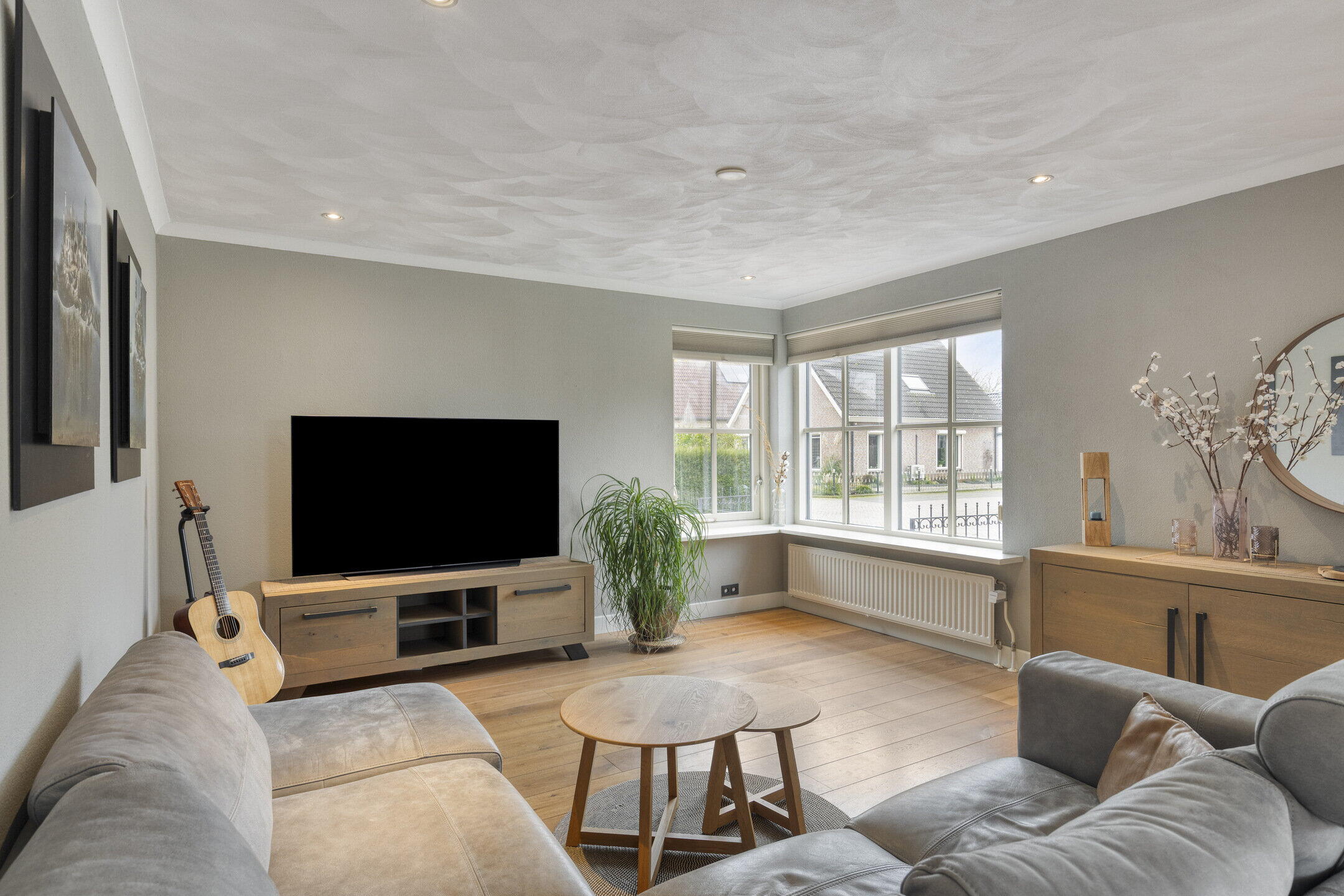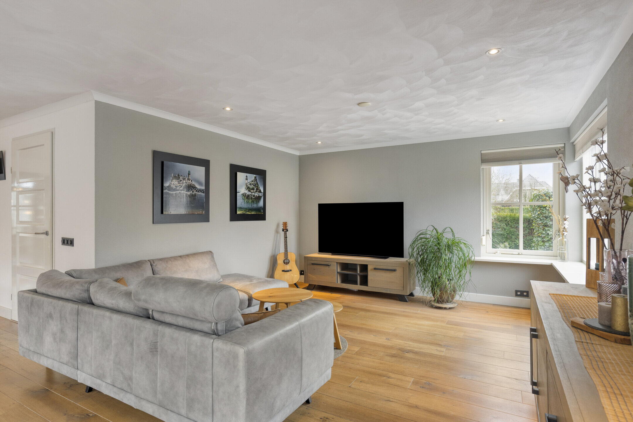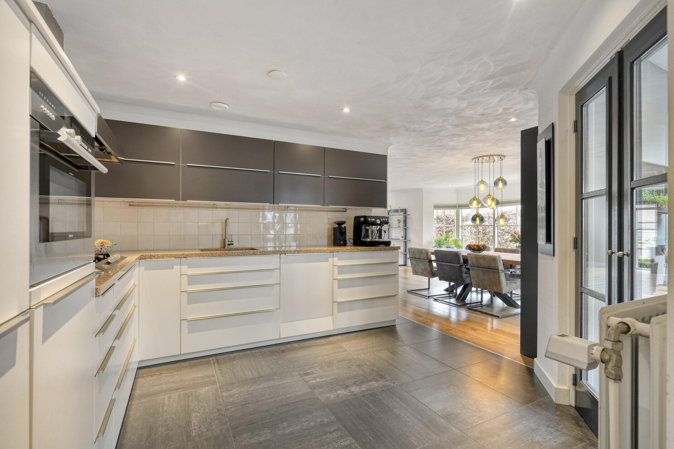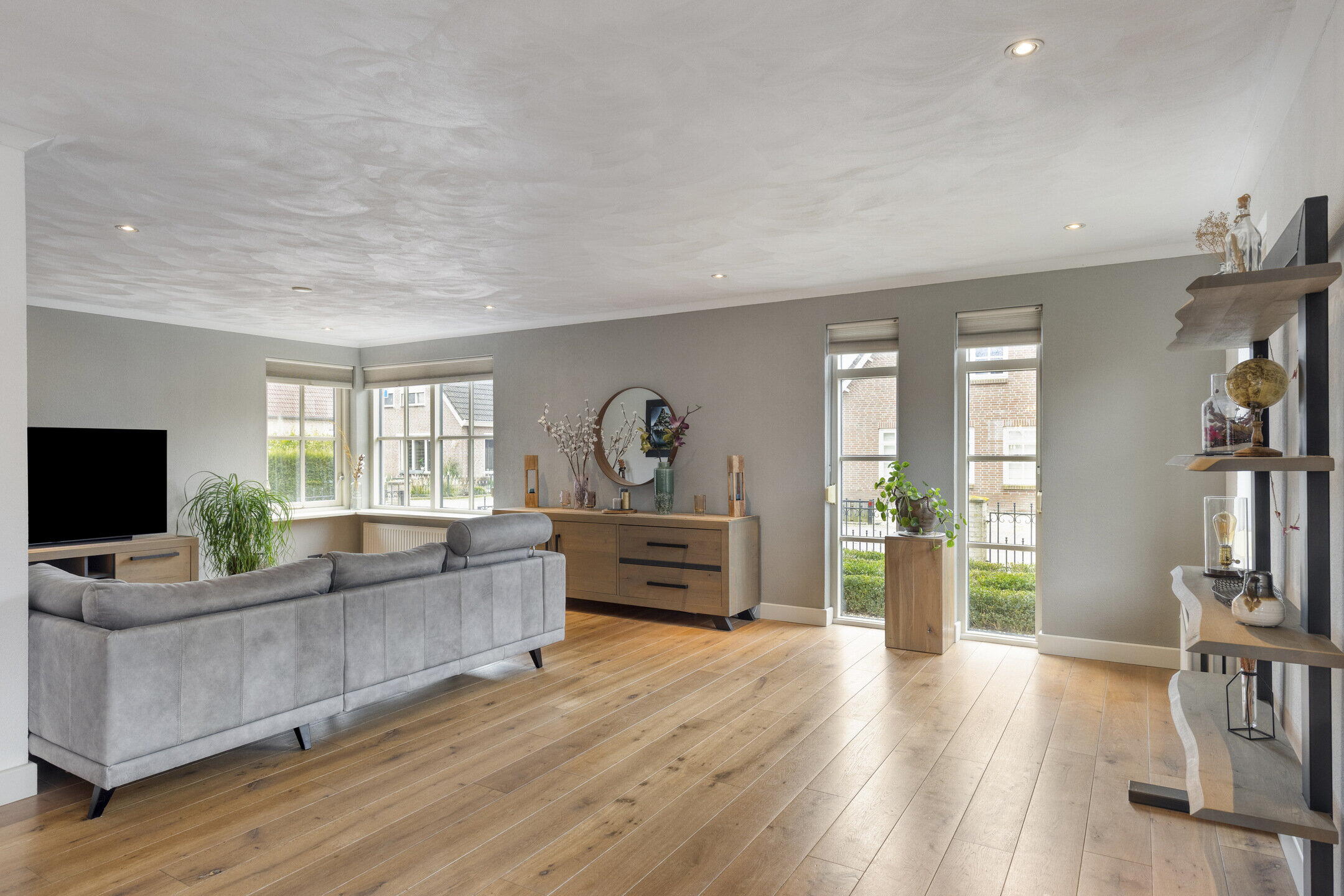De zeer royale woonkamer biedt volop ruimte voor een comfortabele zithoek, waar je heerlijk tot rust komt. De erker aan de zijkant zorgt voor een prettige lichtinval rondom de eettafel. Hier past met gemak een groot formaat eettafel, ideaal voor lange diners en gezellige momenten met familie en vrienden. De woon- en eetkamer zijn afgewerkt met een houten vloer, wat bijdraagt aan de warme en tijdloze uitstraling van de ruimte.