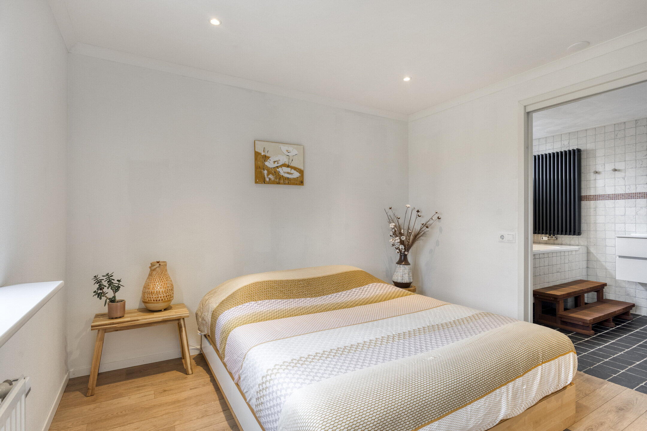 Vanuit de keuken bereik je een tussenhal met vaste kasten en de witgoedaansluiting. Vanuit deze hal is er toegang tot de slaapkamer op de begane grond met aangrenzend een badkamer. De badkamer is voorzien van een ligbad met douche, wastafelmeubel en toilet. Dankzij het ventilatieraam met daglicht en de royale opzet is dit een comfortabele ruimte, wat de woning uitermate geschikt maakt voor alle levensfasen.