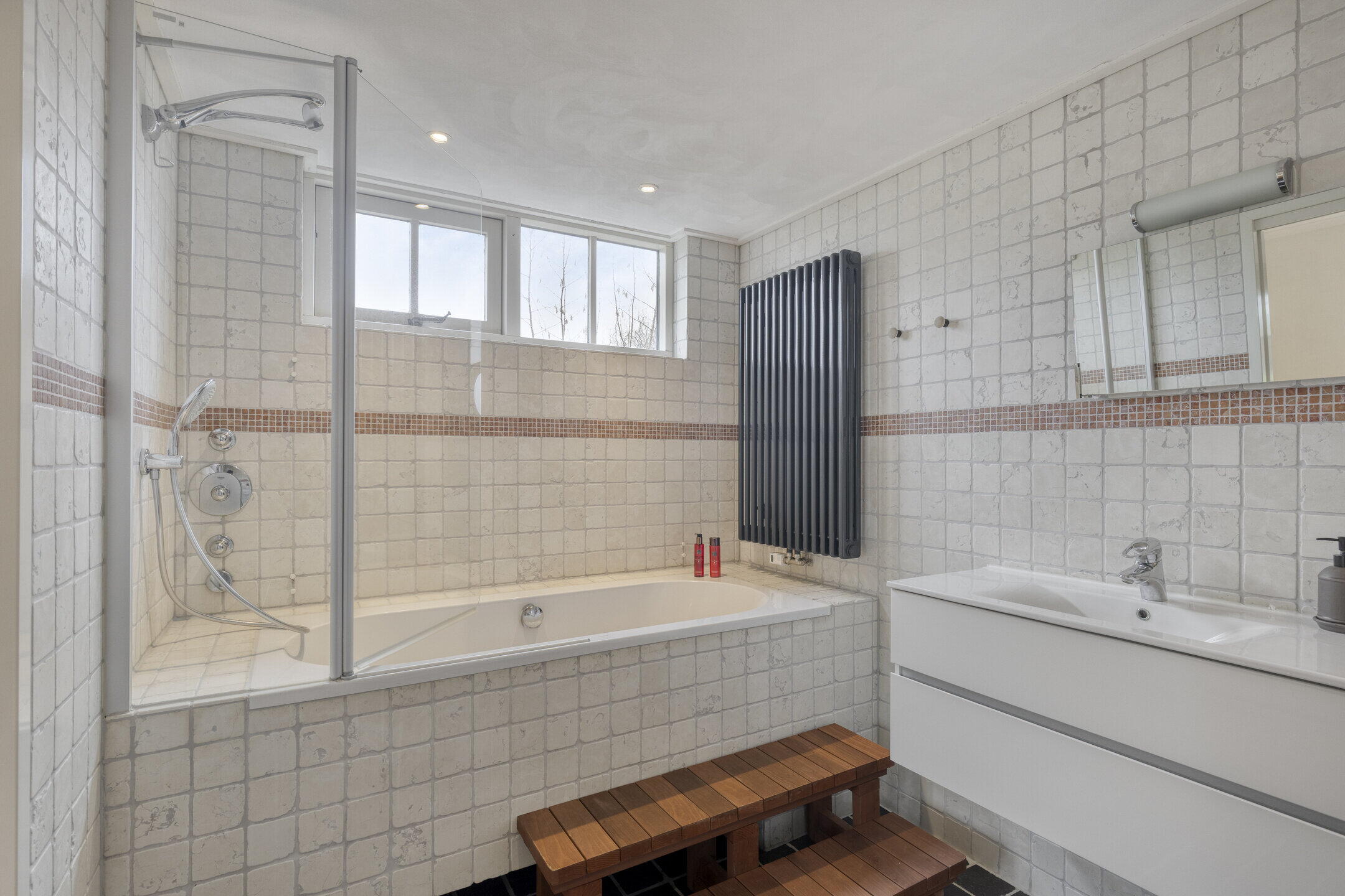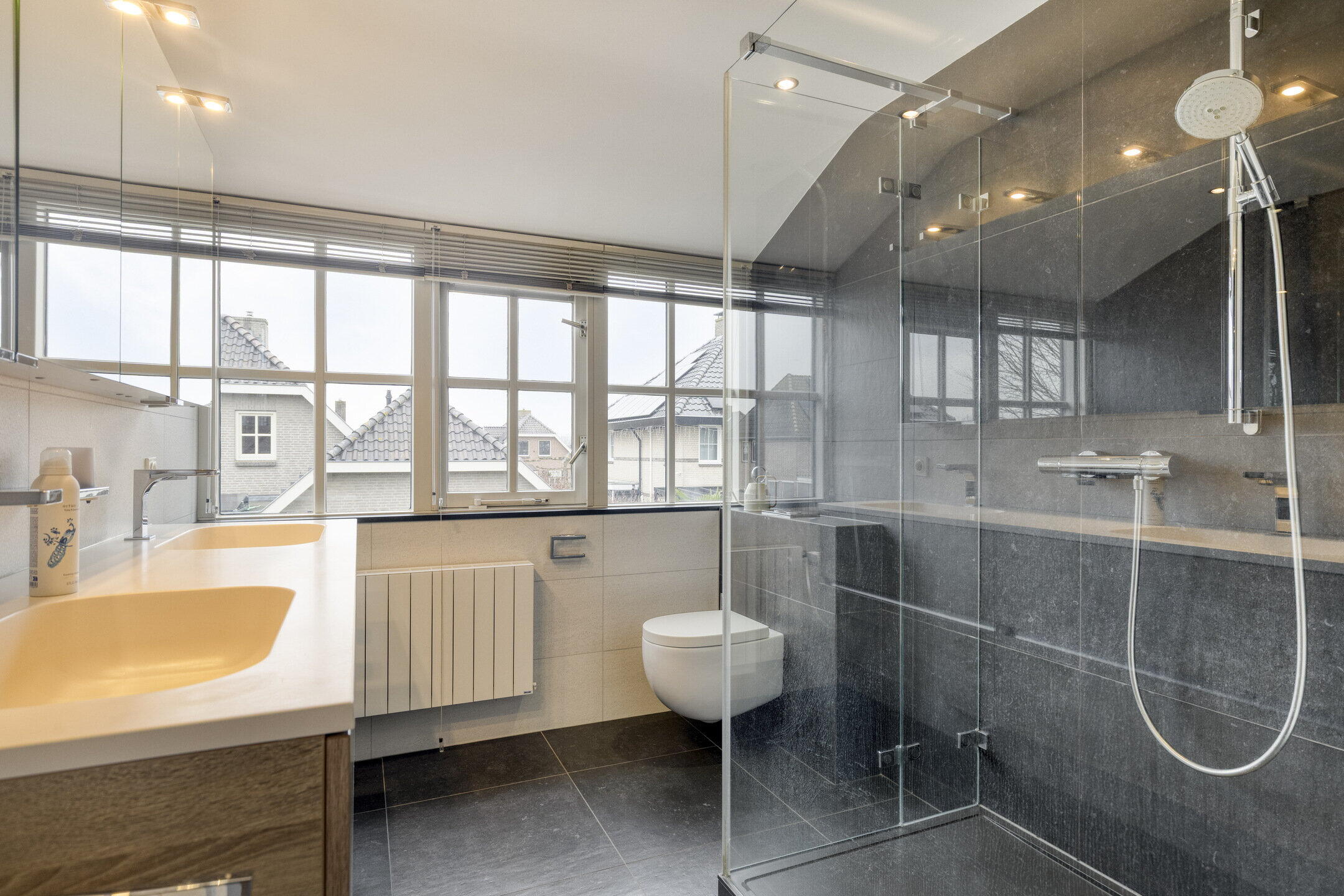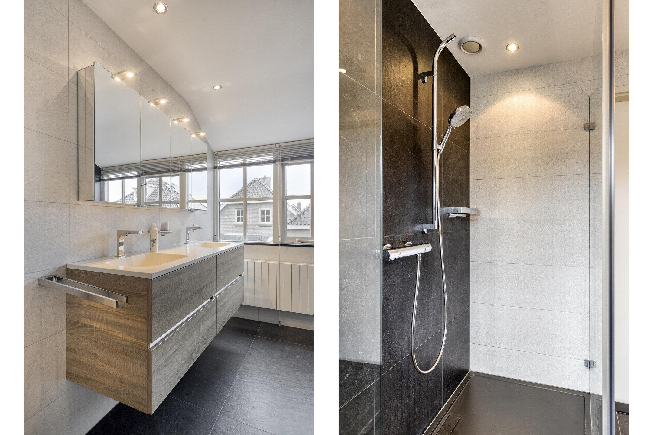 De tweede badkamer, tussentijds vernieuwd in 2013, is voorzien van een toilet, een dubbel wastafelmeubel en een inloopdouche. De dakkapel zorgt hier voor extra ruimte en veel daglicht.