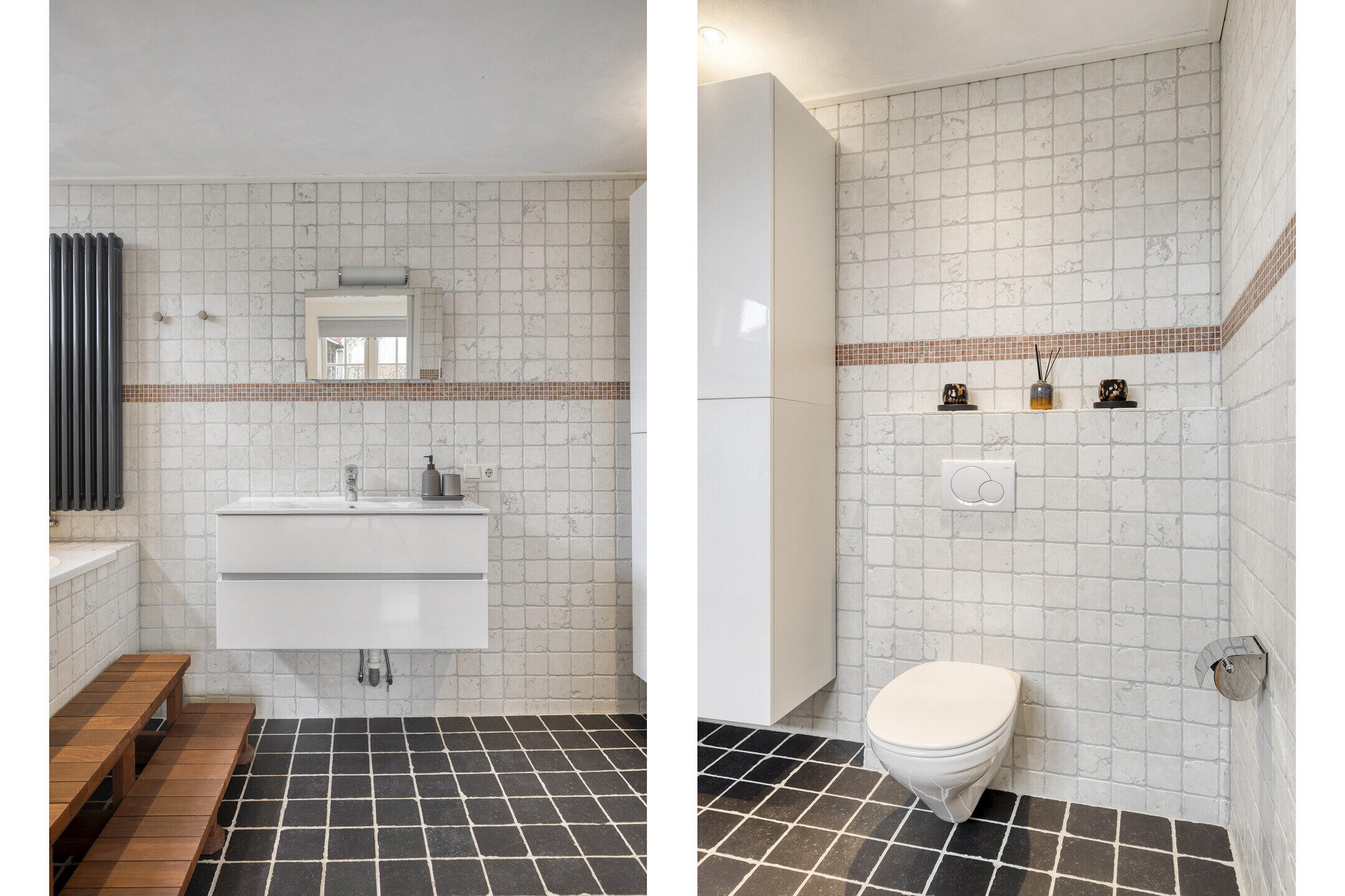 - Toilet, dubbele wastafel, wastafelmeubel, inloopdouche ligbad, toilet