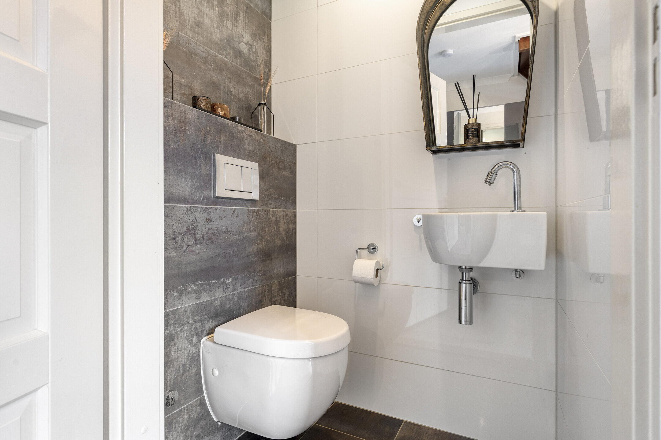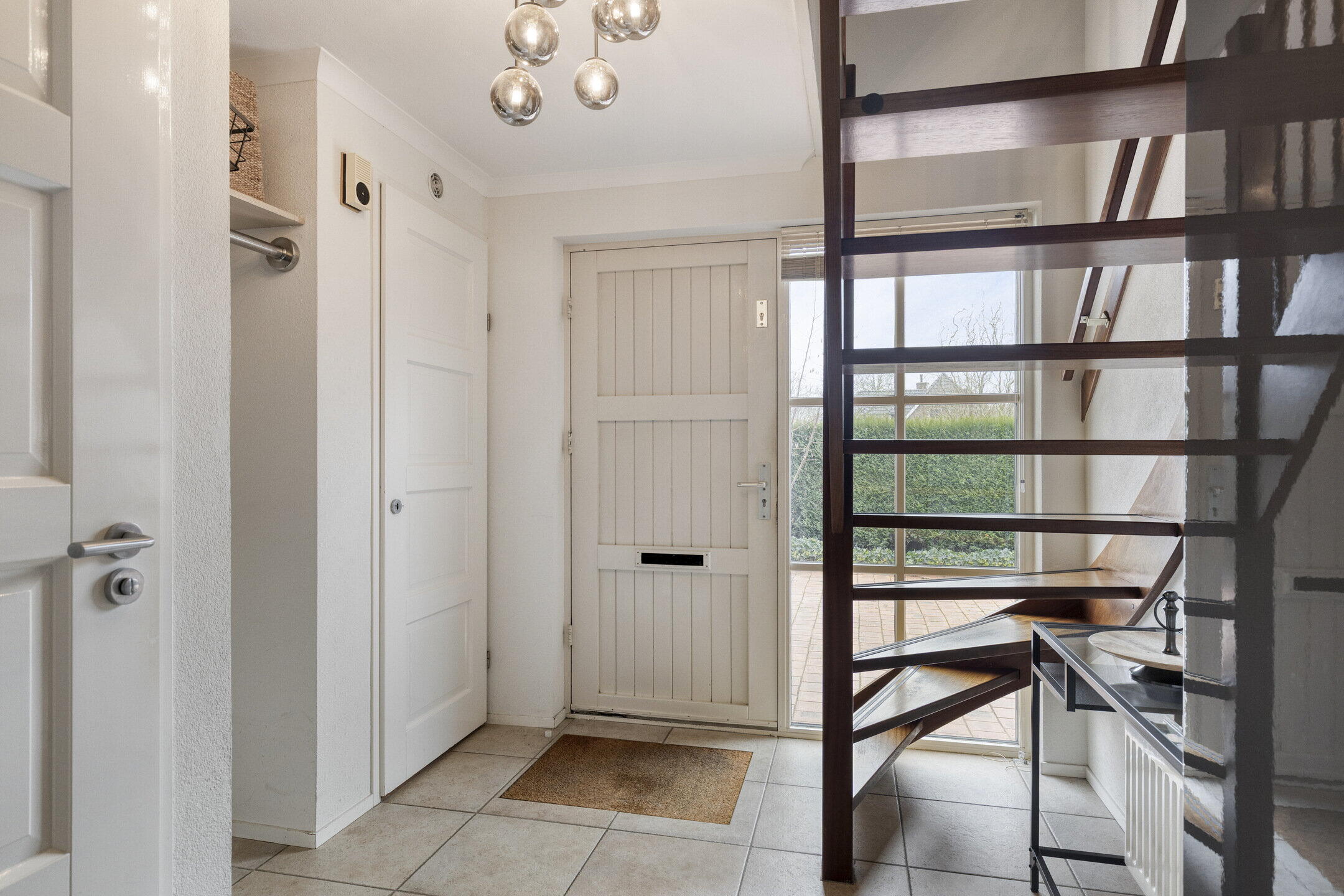 Begane grond: je stapt binnen in een heerlijk lichte hal met een praktische garderobenis, meterkast en een modern toilet met hangend closet met fontein. De trapopgang naar de eerste verdieping bevindt zich eveneens in de hal.